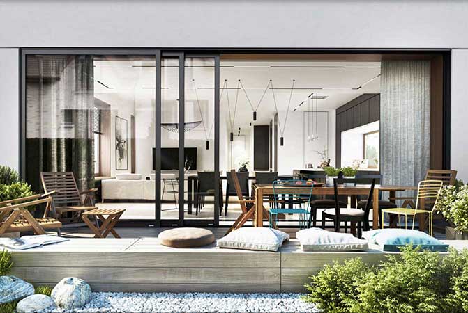 Każdy apartament posiada bardzo duży balkon lub taras. Ogromne przesuwne drzwi typu HS łączą bezpośrednio balkon lub tarasy z wnętrzem lokali. Takie rozwiązanie ułatwia aranżacje wnętrza, jednocześnie otwierając mieszkania na zieleń i przestrzeń. Dodatkowo apartamenty zaprojektowano tak, aby zapewnić maksymalną funkcjonalność przestrzeni np. poprzez czytelne oddzielenie części dziennej od prywatnej każdego z nich. Jednocześnie układ oraz szerokość lokali pozwala na maksymalną możliwość aranżacji przestrzeni. Przestronne pomieszczenia i panoramiczne okna to kolejne atuty Willi Halina. Wysokość apartamentów /ponad 3 metry/ dodatkowo daje poczucie komfortu i bezpieczeństwa. Warto nadmienić, że każdy z apartamentów to odpowiednik domu jednorodzinnego o powierzchni ok. 280 m2. Powyższe wynika z faktu odjęcia od domu jednorodzinnego powierzchni garażów, komunikacji oraz pomieszczeń technicznych.